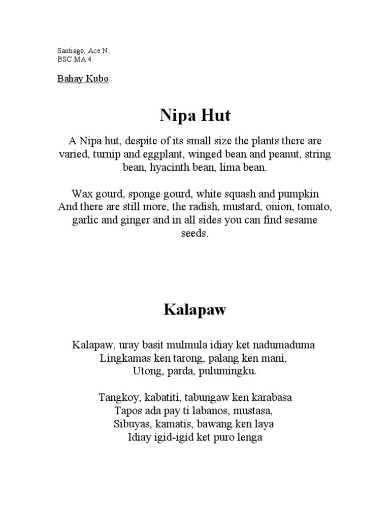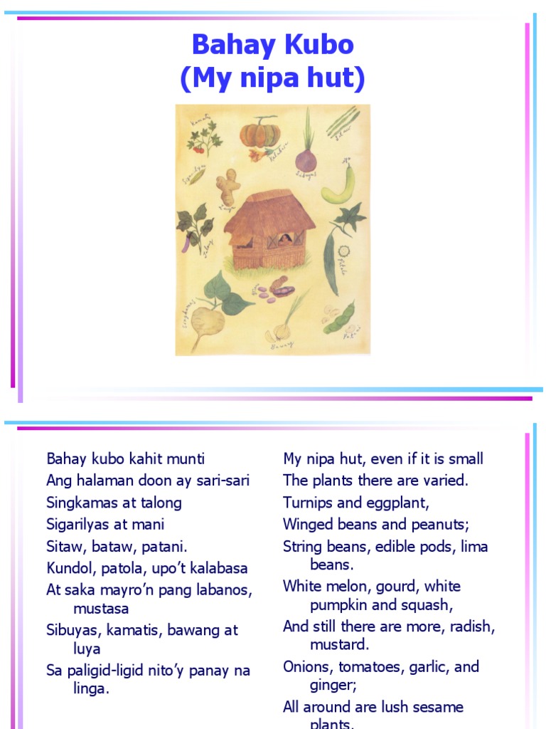 Bahay kubothis is the last flash animation i worked on during my internship in the knowledge channel. Bahay kubo or nipa hut in english is a filipino traditional dwelling place made of genuine green materials like nipa leaves for the roof and split bamboos for the. Bahay kubo is a traditional filipino folk song. The musical form of bahay kubo is unitary form. The song was composed when the first american teachers arrived in the philippines to educate the.
