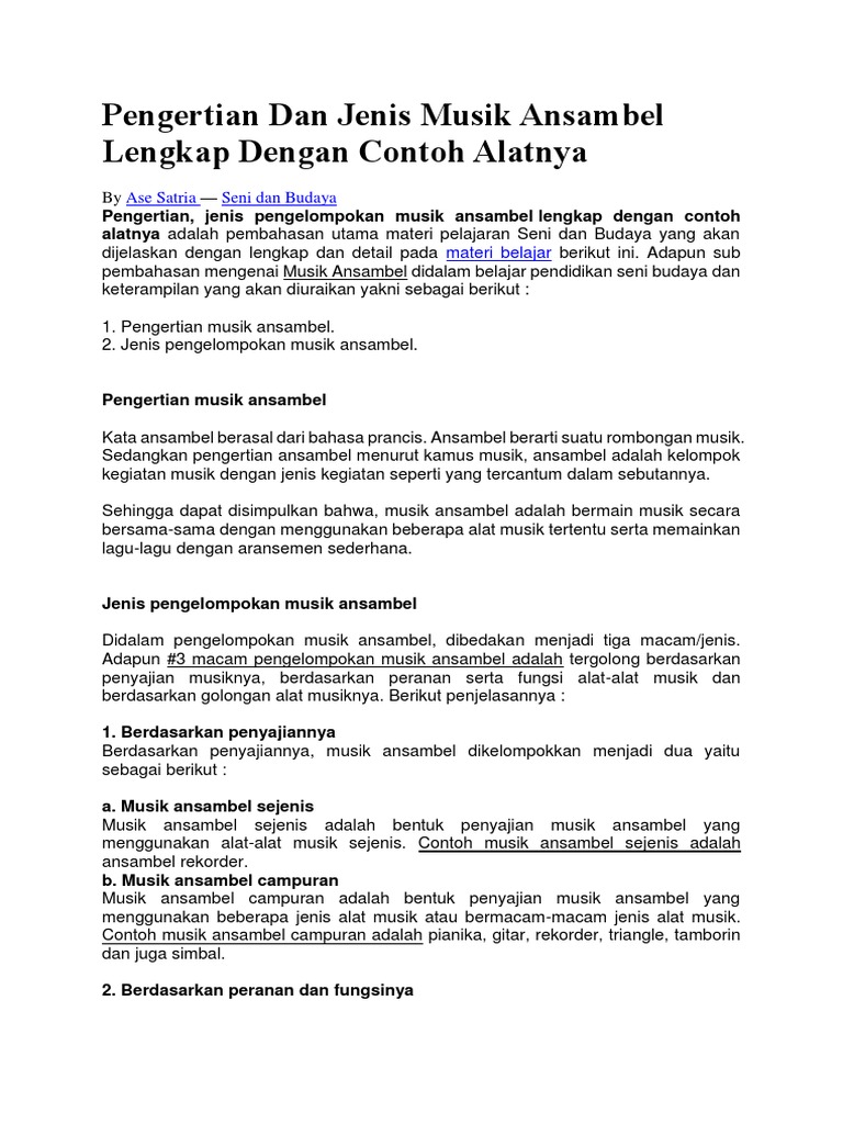 √ Pengertian Musik Ansambel, Jenis, Cara dan Contohnya from pendidikan.co.id Disini pakdosen membahas secara rinci tentang pengertian, pengertian menurut para ahli, jenis, fungsi, golongan, peran, cara. Tata cara memainkan alat musik. Tahukah anda jawaban yang benar? Sekian ulasan mengenai musik ansambel. Musik ansambel ada dua jenis, yaitu ansambel campuran dan ansambel sejenis. Setiap alat musik memerlukan teknik bermain yang berbeda. Apabila kelompok tersebut merupakan musik ansambel sejenis sudah tentu mereka memainkan musik secara. Pengertian, pengertian menurut para ahli, jenis, fungsi, golongan, peran, cara dan contoh.